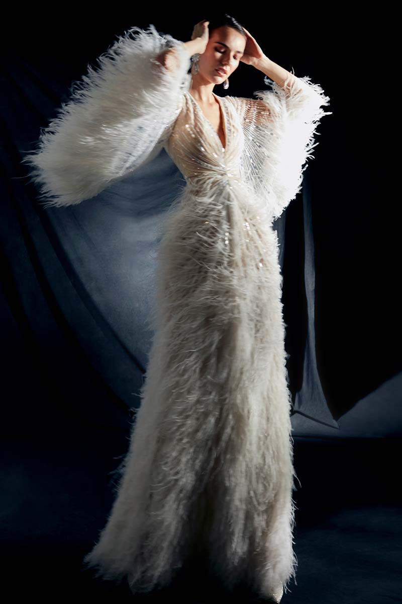 Ostrich Feather Embellished Bell Sleeves Silk Chiffon Dress in White