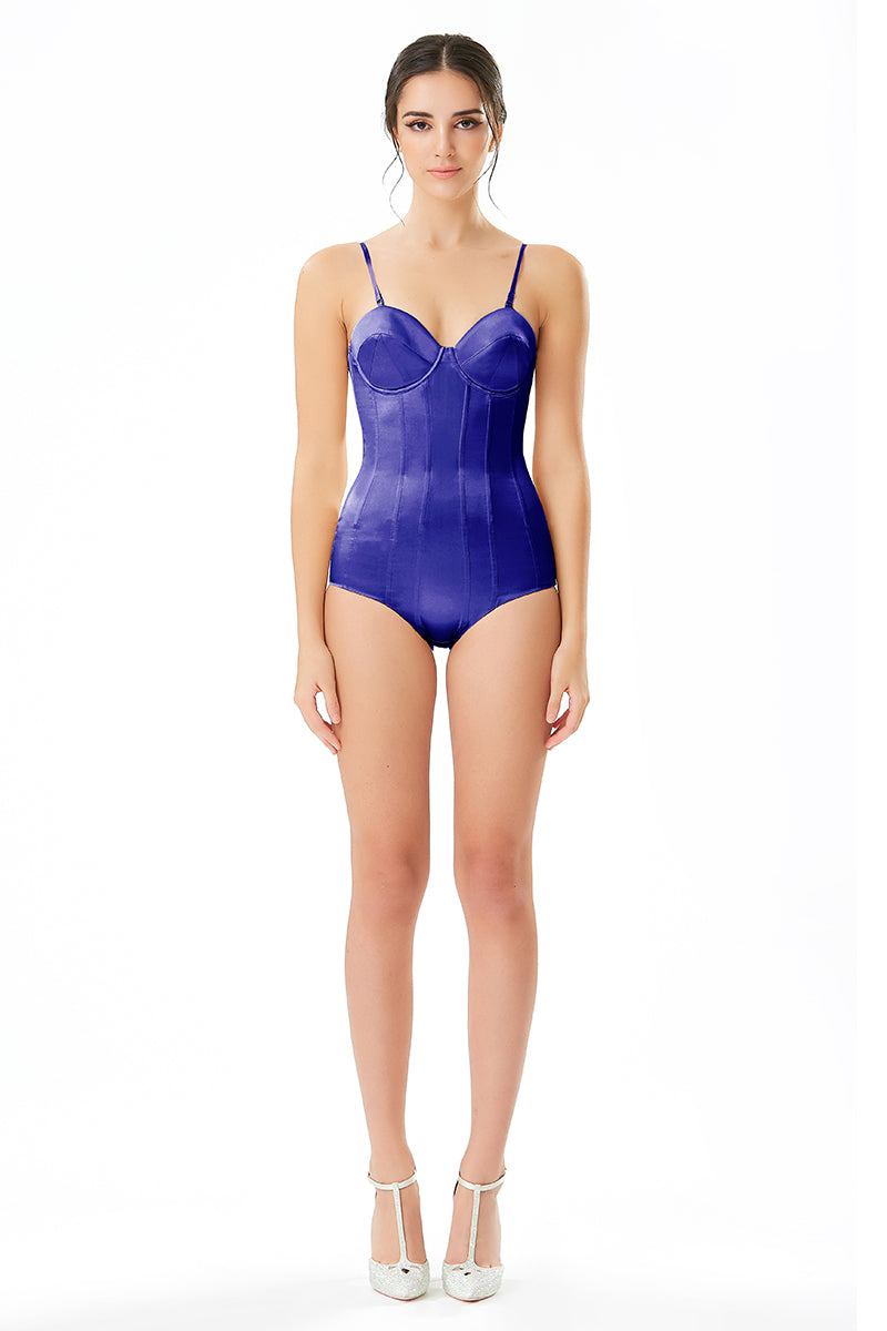Incredibly versatile, the Silk Satin Corseted Bodysuit in Royal Blue easily accommodates varying styles to be part of countless ensembles. Made from top notch silk satin, it is both minimalist and elegant for it features a monochrome appearance and visible luxurious sheen. This piece is stretchable and has boning to the front, back and sides to provide overall cinching and support for the ultimate figure perfecting finish. A definite wardrobe essential, this chic bodysuit goes well with any pair of bottoms – from dressy pencil skirts to dramatic bootcut pants.